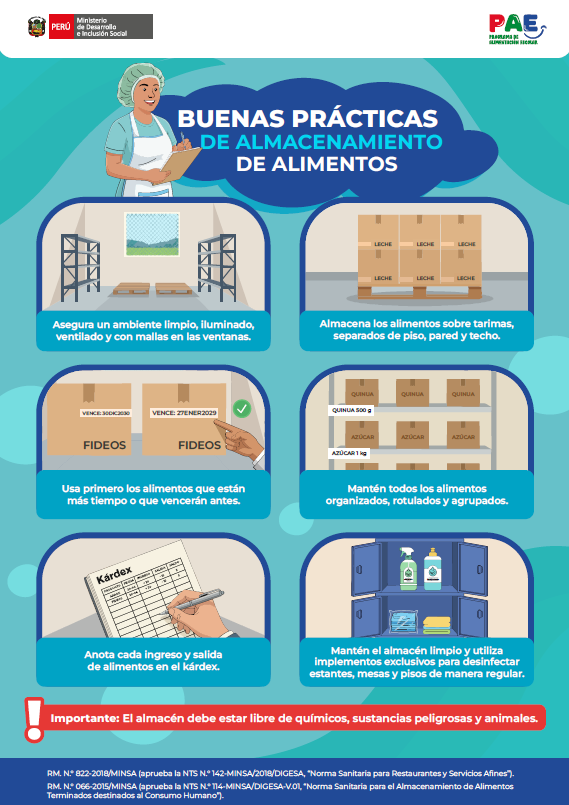 El afiche tamaño A3 titulado “Buenas prácticas de Manipulación de Alimentos”, está dirigido a los Comités de Alimentación Escolar (CAE) y manipuladores de alimentos, con el propósito de fortalecer la correcta manipulación durante las etapas de preparación y servicio del programa alimentario.