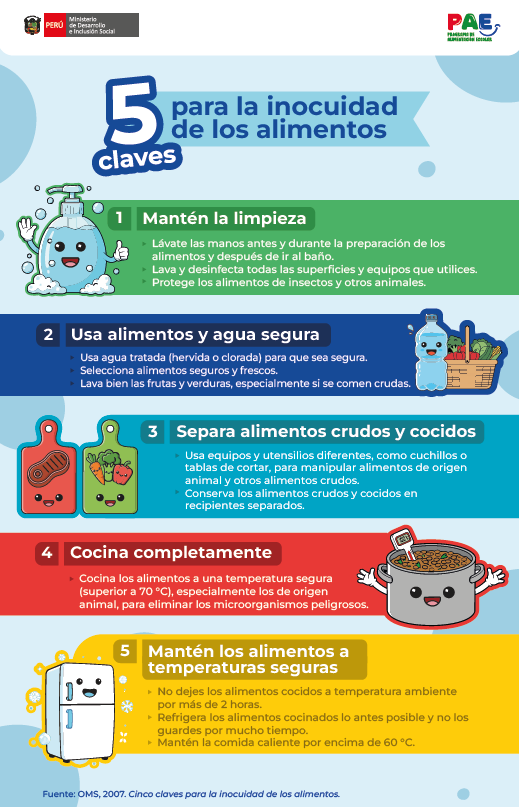 El afiche tamaño A3 titulado “5 claves para la inocuidad de los alimentos” está dirigido a los Comités de Alimentación Escolar (CAE) y tiene como finalidad fortalecer la aplicación de buenas prácticas de manipulación durante el servicio alimentario escolar.