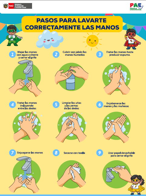 El roll screen “Pasos para lavarte correctamente las manos” es un recurso educativo visual elaborado de acuerdo con la normativa peruana vigente en higiene y promoción de la salud, orientado a reforzar prácticas adecuadas de lavado de manos en la población escolar.