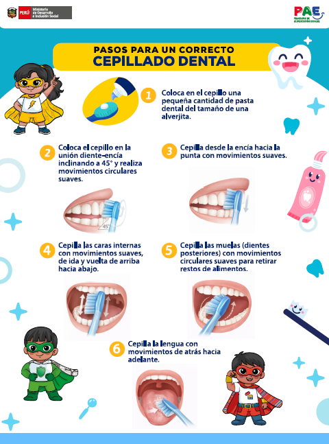 El roll screen presenta de manera secuencial y didáctica los pasos correctos para el cepillado dental, incluyendo la cantidad adecuada de pasta, la posición del cepillo y los movimientos recomendados para la limpieza de dientes, muelas y lengua. La incorporación de Los Héroes SuperPAE refuerza el aprendizaje lúdico y contribuye a la adopción de prácticas saludables como parte del cuidado integral de la salud en la comunidad educativa.